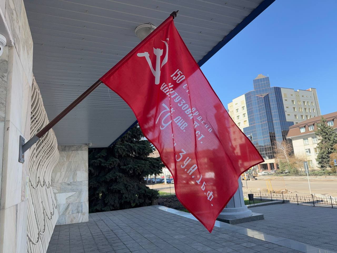 | В рамках подготовки и проведения празднования 80-й годовщины Победы в Великой Отечественной войне 1941-1945 годов 04 апреля 2025 года на фасаде здания Верховного Суда ЛНР размещена копия Знамени Победы. | версия для печати |